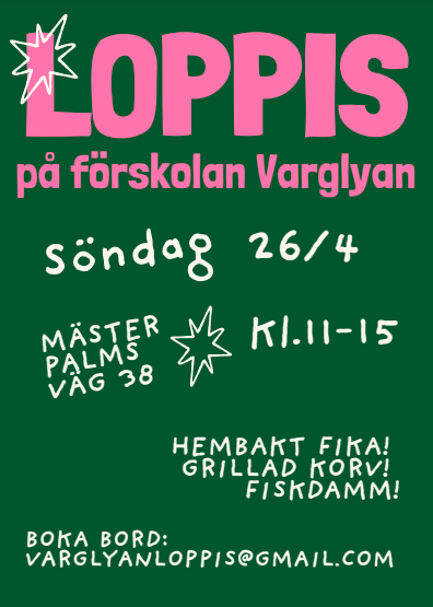 Söndag 26 maj klockan 11.00–15.00 arrangerar vi vårloppis på Varglyan, Mäster Palms väg 38.