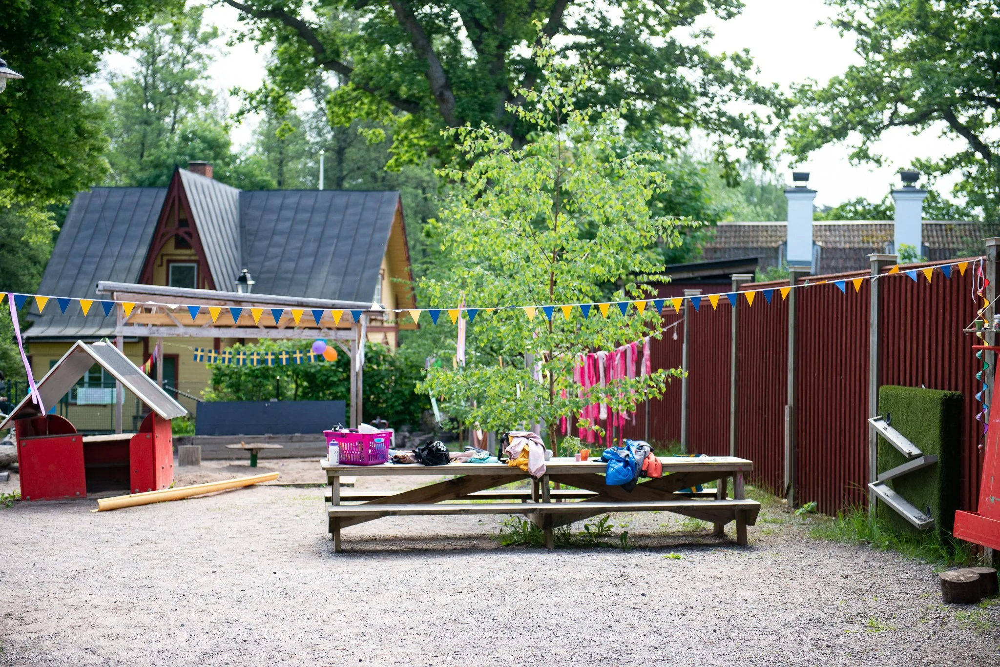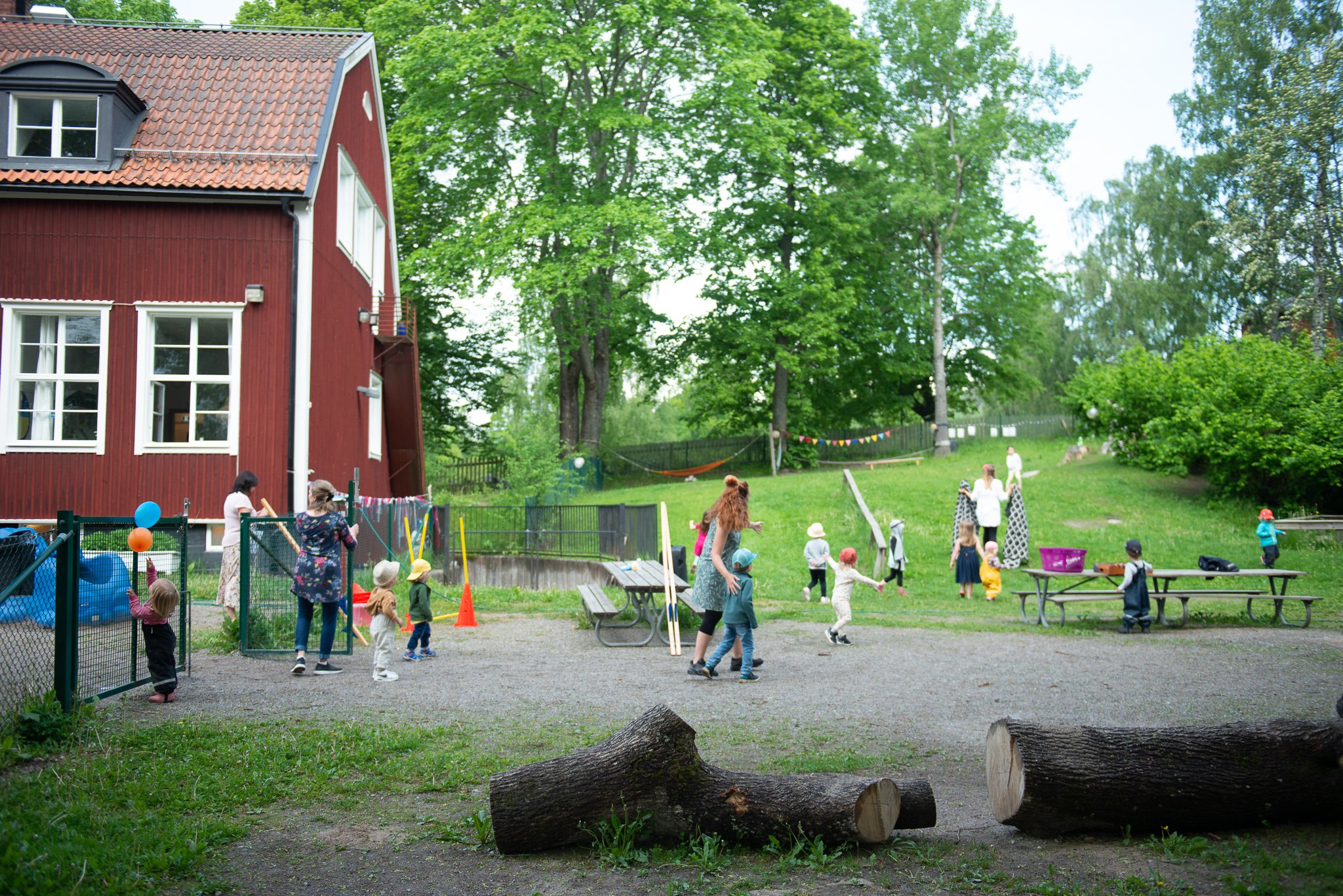 Förskolan har en stor naturgård på över 2000 kvm som erbjuder barnen en fantastisk utemiljö. Här finns skrymslen att utforska, flera pallkragar att odla i, rutschkanor, sandlådor, vindskydd, en lång pulkabacke, snickarbod och hänggungor som barnen står i kö till året om. Gården är så stor att vi har delat in den i två delar och kan låta barngruppen leka på två olika gårdar om det behövs.